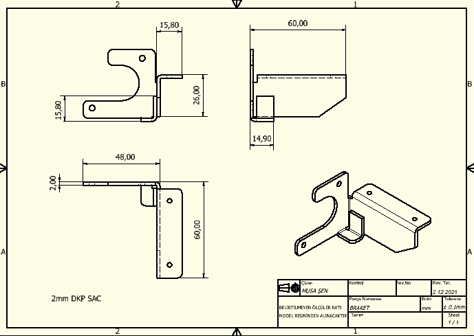 3 boyutlu tasarımların üretiminde ve arşivlendirilmesinde kullanılmak üzere teknik resim dökümanı oluşturulması.